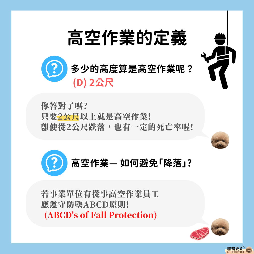 安全帽與其他防護具 在高度2公尺以上的高處作業,勞工應確實使用安全帽及其他必要的防護具。