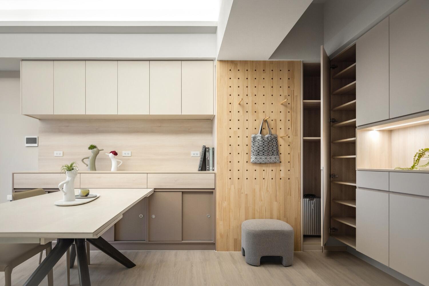 - 垂直與畸零收納:利用牆高、角落、柱旁做系統櫃或吊櫃,釋放地面,維持動線流暢,特別適合玄關、走道或小宅。