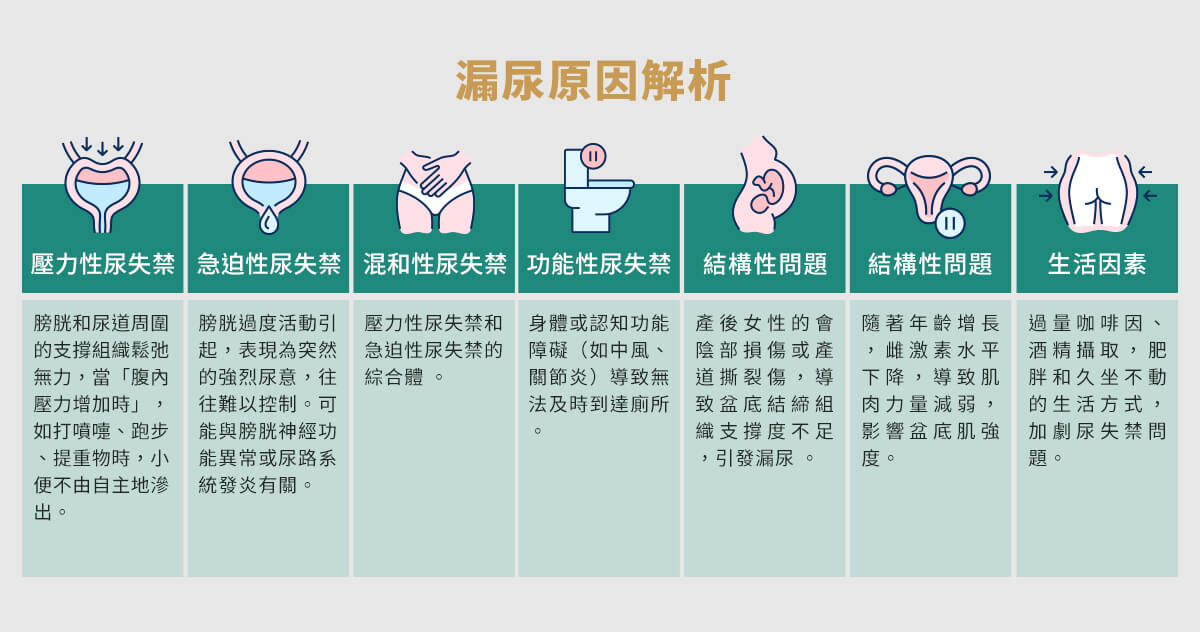 - 腹壓突然增加(如打噴嚏、咳嗽、提重物)時,骨盆底肌肉或尿道括約肌無法有效支撐膀胱,導致尿液外洩。這就像「水龍頭關不緊」,常因生產、老化或荷爾蒙變化引起。
