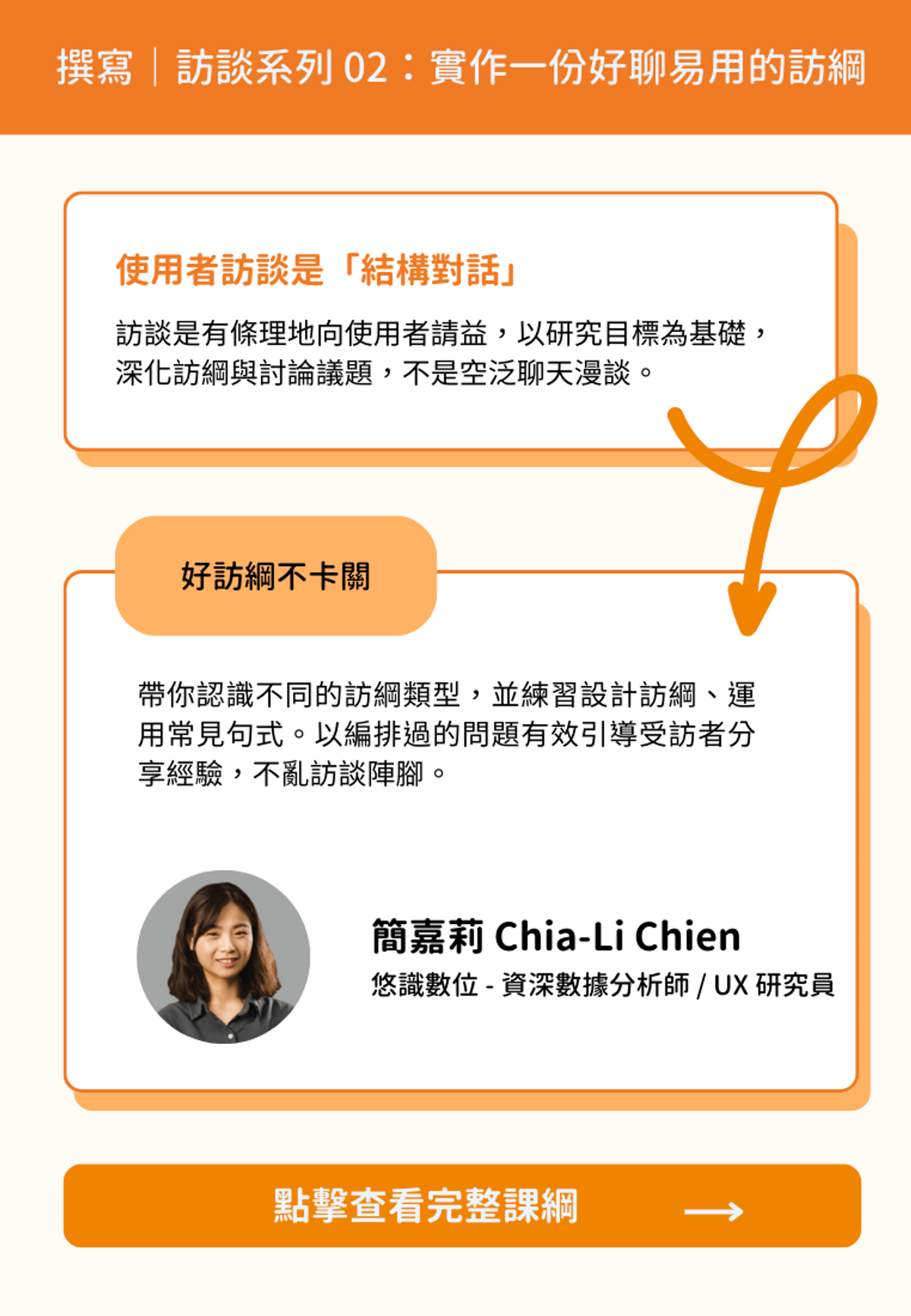 一位資深使用者經驗研究員分享,進入 UX 領域四年多的學習過程中,最重要的是從實踐中摸索自己最適合的方式。在擔任初級研究員階段,她不斷感受研究方法的運作差異,並思考如何優化執行過程中的各個環節。