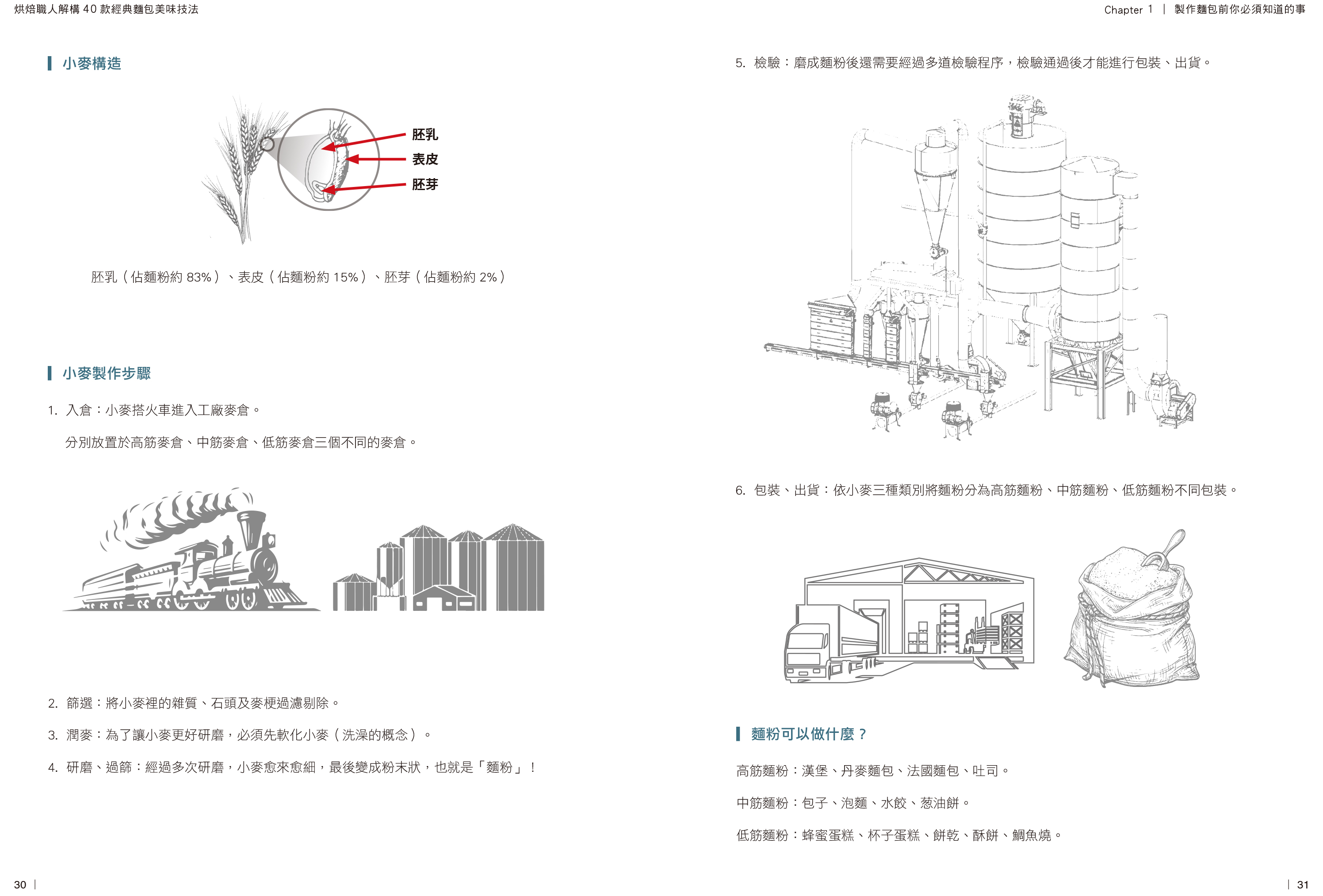 麵粉的主要差別在於蛋白質(麵筋)含量,影響麵團彈性和發酵膨脹: