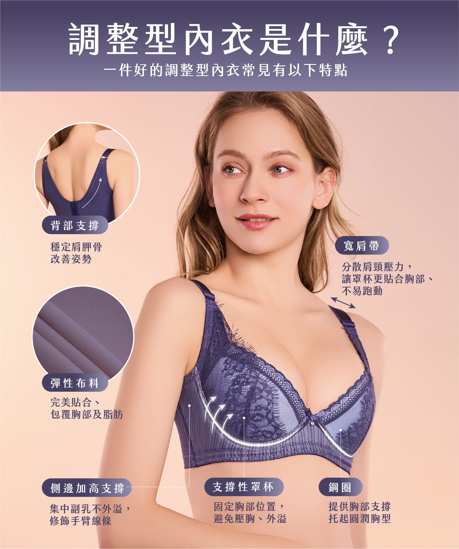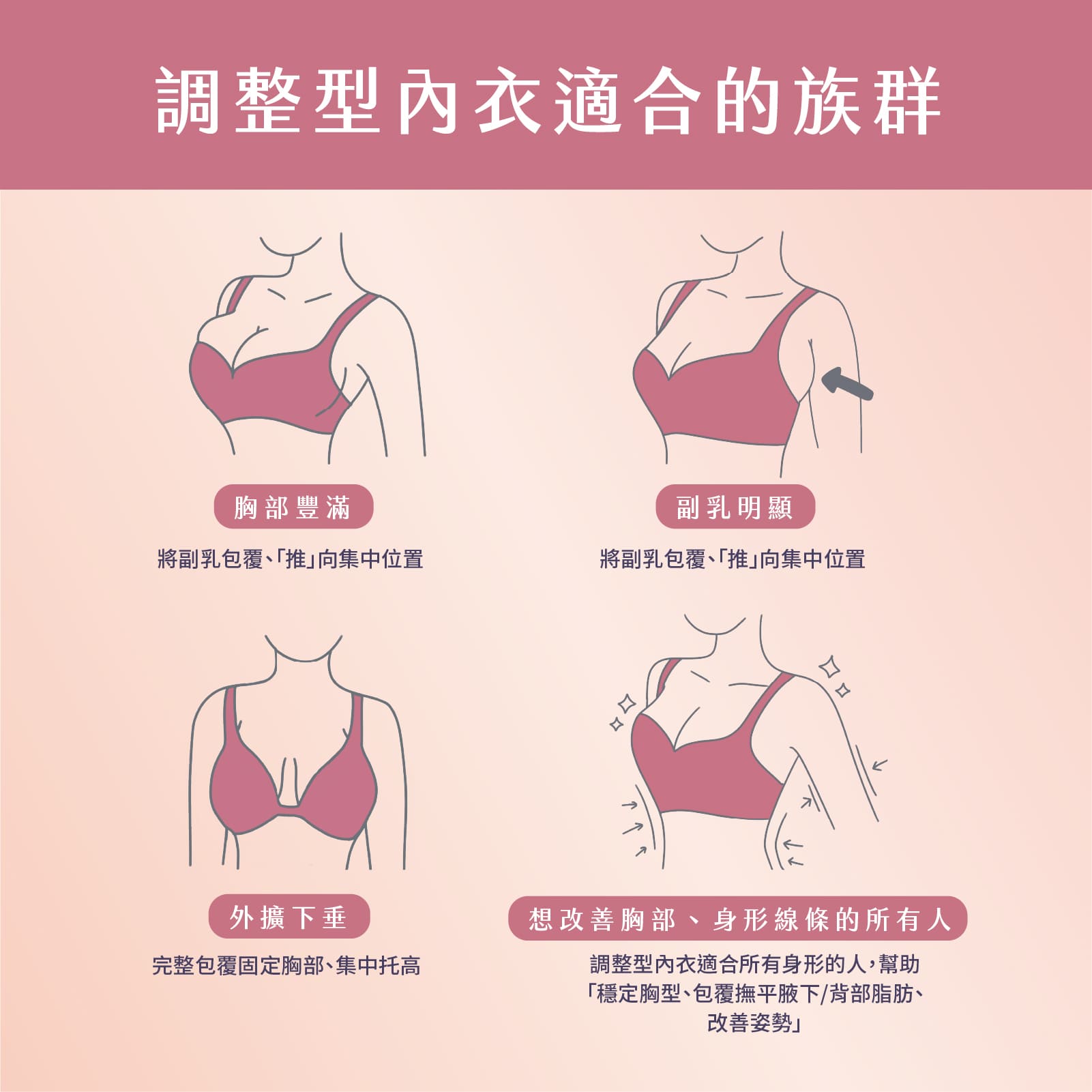 寬肩帶與側邊加高是最重要的兩個因素。寬肩帶能夠將副乳完整收集進來並遮蔽,而側邊加高設計能擴大包覆範圍,將腋下的脂肪組織完整納入。
