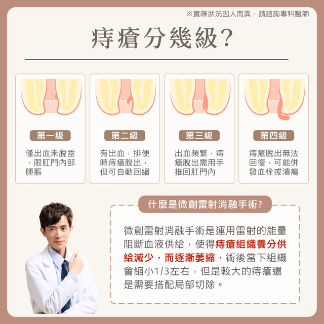 - 其他:微創或雷射手術適用輕中度內痔(無明顯脫垂),環狀切除術(PPH)適合環形脫垂內痔。