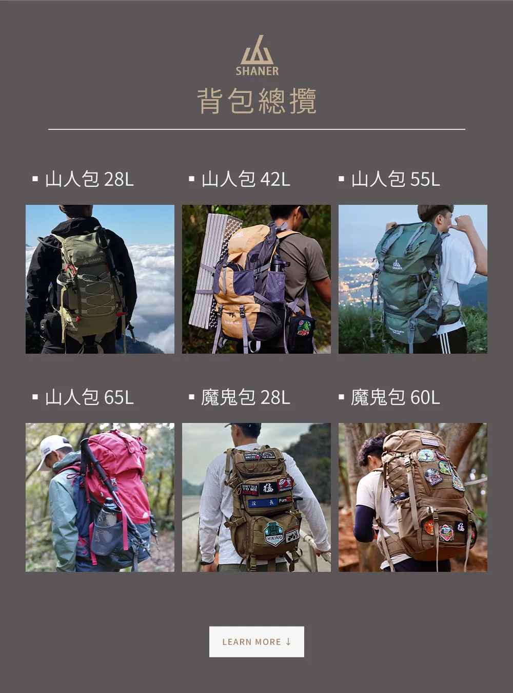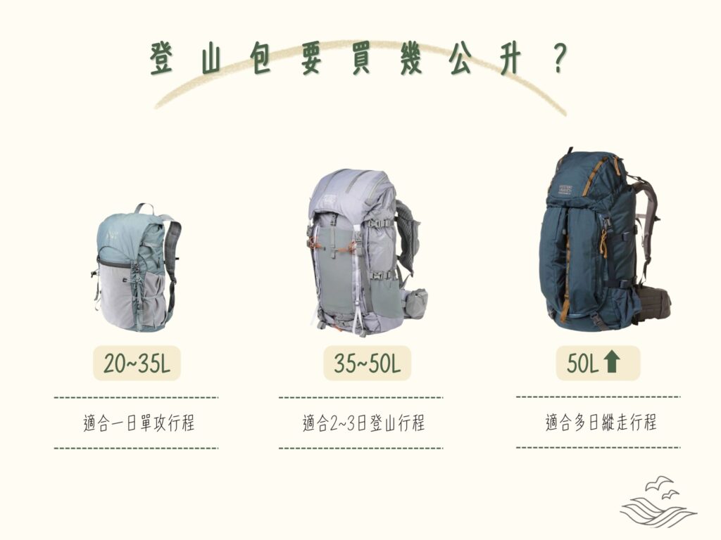 | 2-3日過夜(紮營,自組團) | 35-55L | 含睡袋、帳篷、食物;若輕量化可延長至3-6天。 |