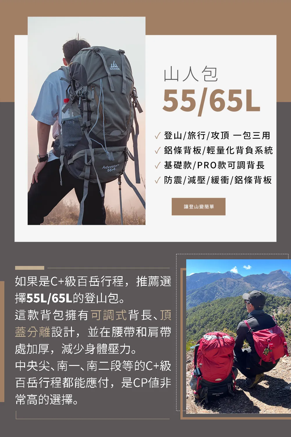 - 擴充設計:選主袋+擴充(如55+10L),增加彈性。