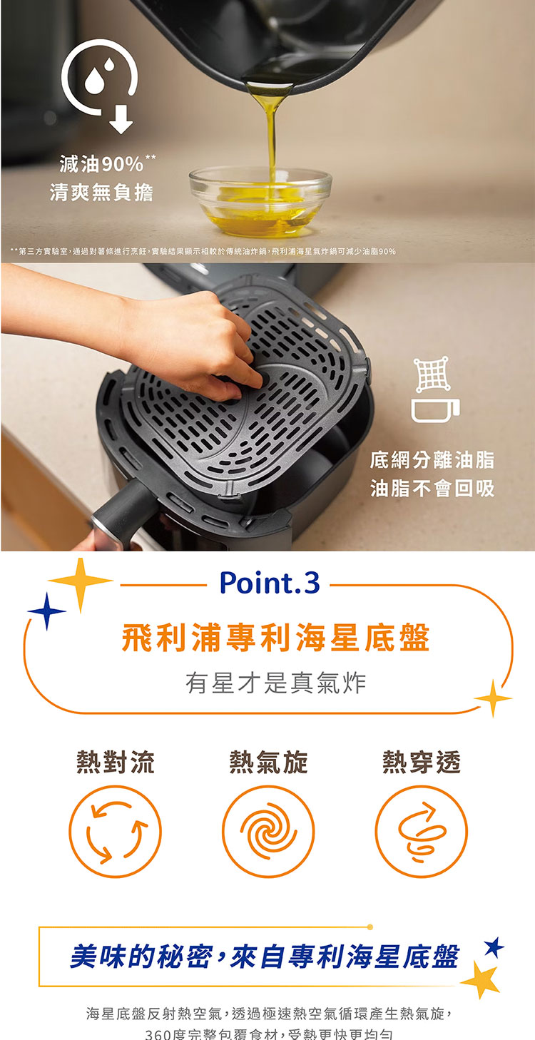 海星底盤的創新設計能減少油煙 99%。其運作原理是將烹飪過程中瀝出的油收集到最下方的底盤,並阻絕上層高溫,使得瀝出的油溫低於發煙點。同時,相較於傳統油炸鍋,飛利浦健康氣炸鍋可減少油脂 90%,還能逼出食材本身多餘油脂。