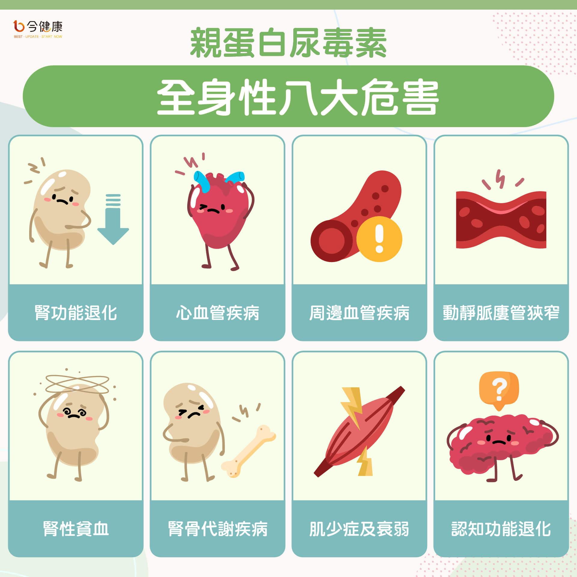 透析患者身體處於慢性發炎狀況,肌肉細胞的粒腺體及修復功能下降,加上身體活動較少,導致肌肉因失用而無力。此外,貧血、男性荷爾蒙缺乏、體內肉鹼缺乏等因素也會導致肌肉無力。