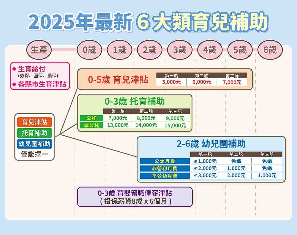 - 滿5歲至入國小前:就讀私立幼兒園滿1個月以上,可領就學補助,比照育兒津貼額度,或在家自行照顧亦可領取。