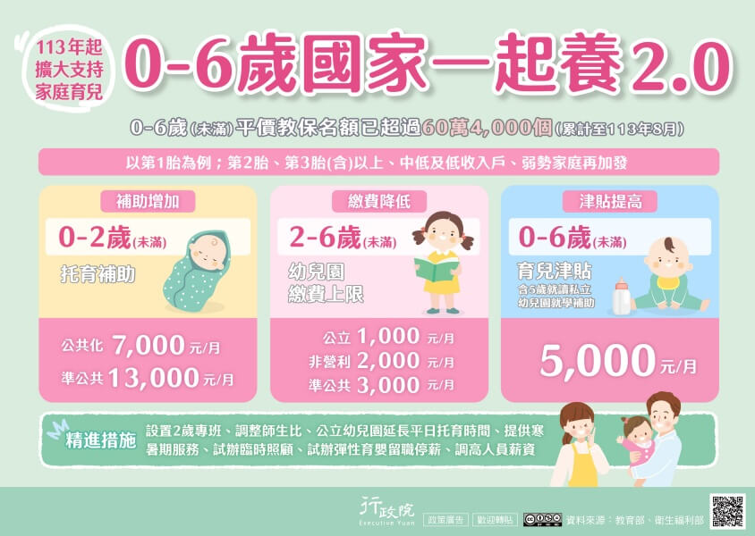 - 年齡限制:兒童0歲至未滿6歲(未滿2歲由衛福部主管,2歲至未滿5歲由教育部國教署主管,部分延伸至6歲)。