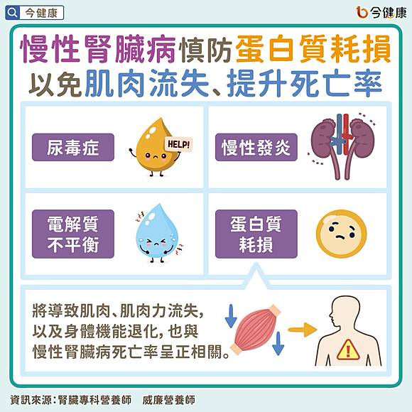 - 尿毒症導致食慾不振、低蛋白飲食限制,造成蛋白質與熱量攝取不足,無法修復肌肉。