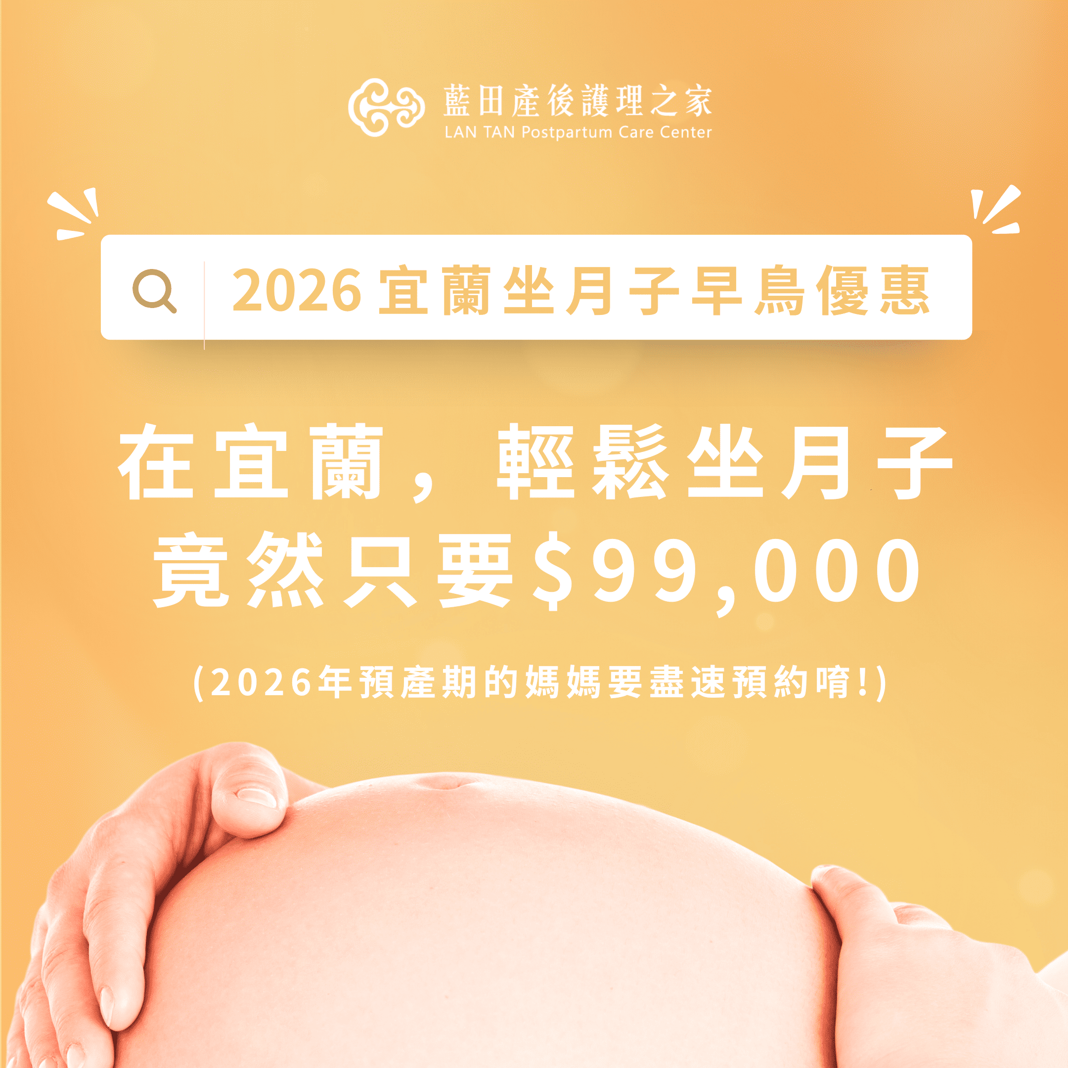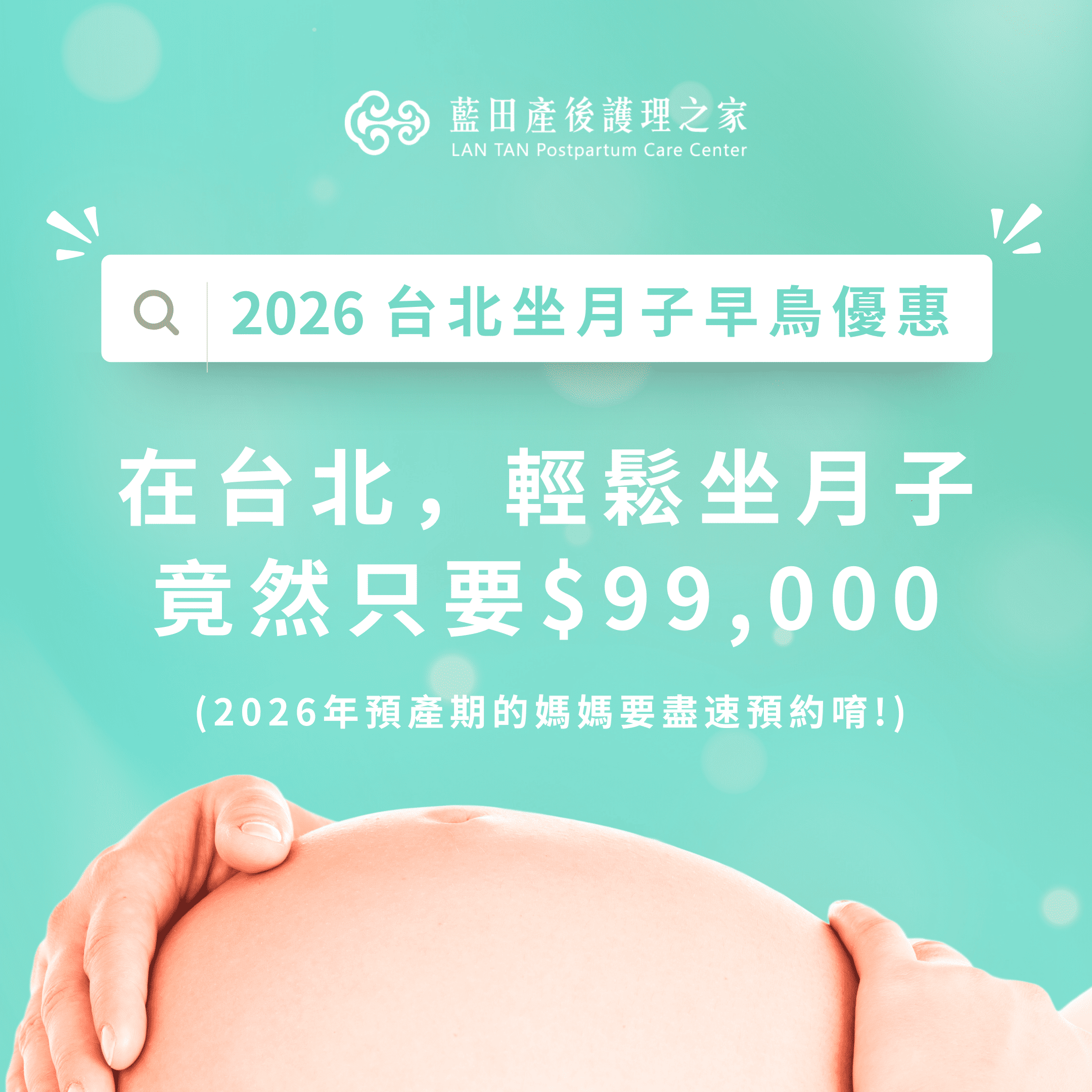 藍田產後護理之家提供多館2026早鳥方案,適合新手爸媽預算考量,花蓮館新手爸媽輕鬆坐月子方案$95,000(12坪大空間,滿10萬贈寶寶游泳體驗),宜蘭館11坪大空間方案$99,000(飯店級空間、獨棟安全設計)。