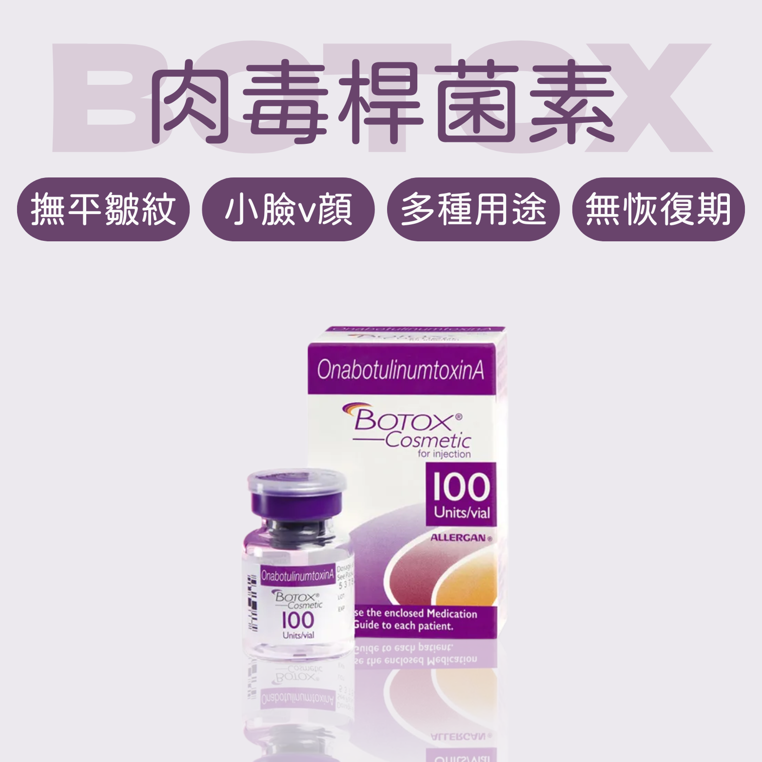 - 主要效果:減少表情肌過度收縮,改善全臉線條,新型液態肉毒提升效率與低痛感。