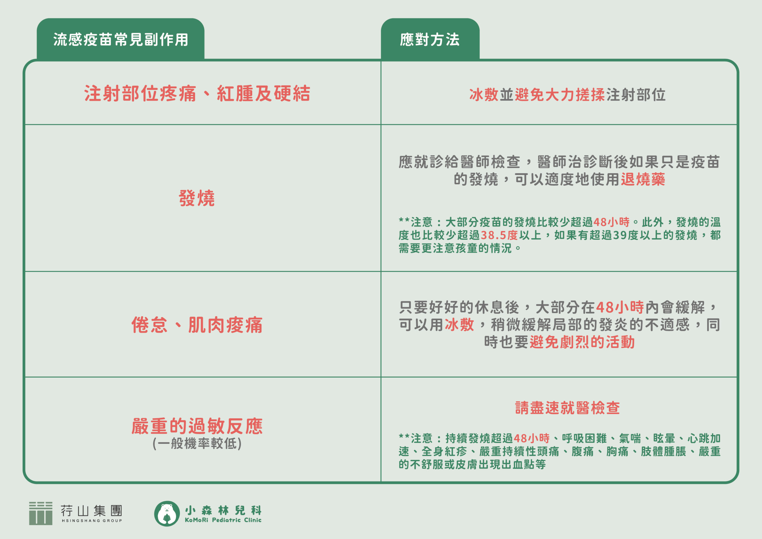 - 接種前:告知醫師個人病史、過敏史、慢性病、服藥情況、懷孕或哺乳狀態,以評估風險。