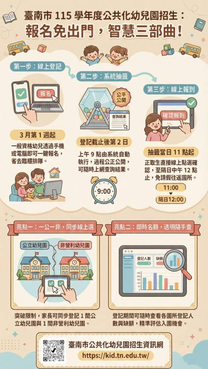 - 所需文件:包含幼兒戶籍資料影本、入園安置證明(如有)、醫療證明等,所有資料單面列印,並親送或郵寄至原園或教育局指定單位。