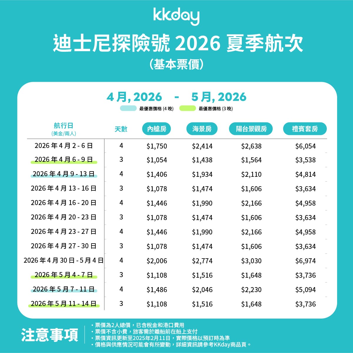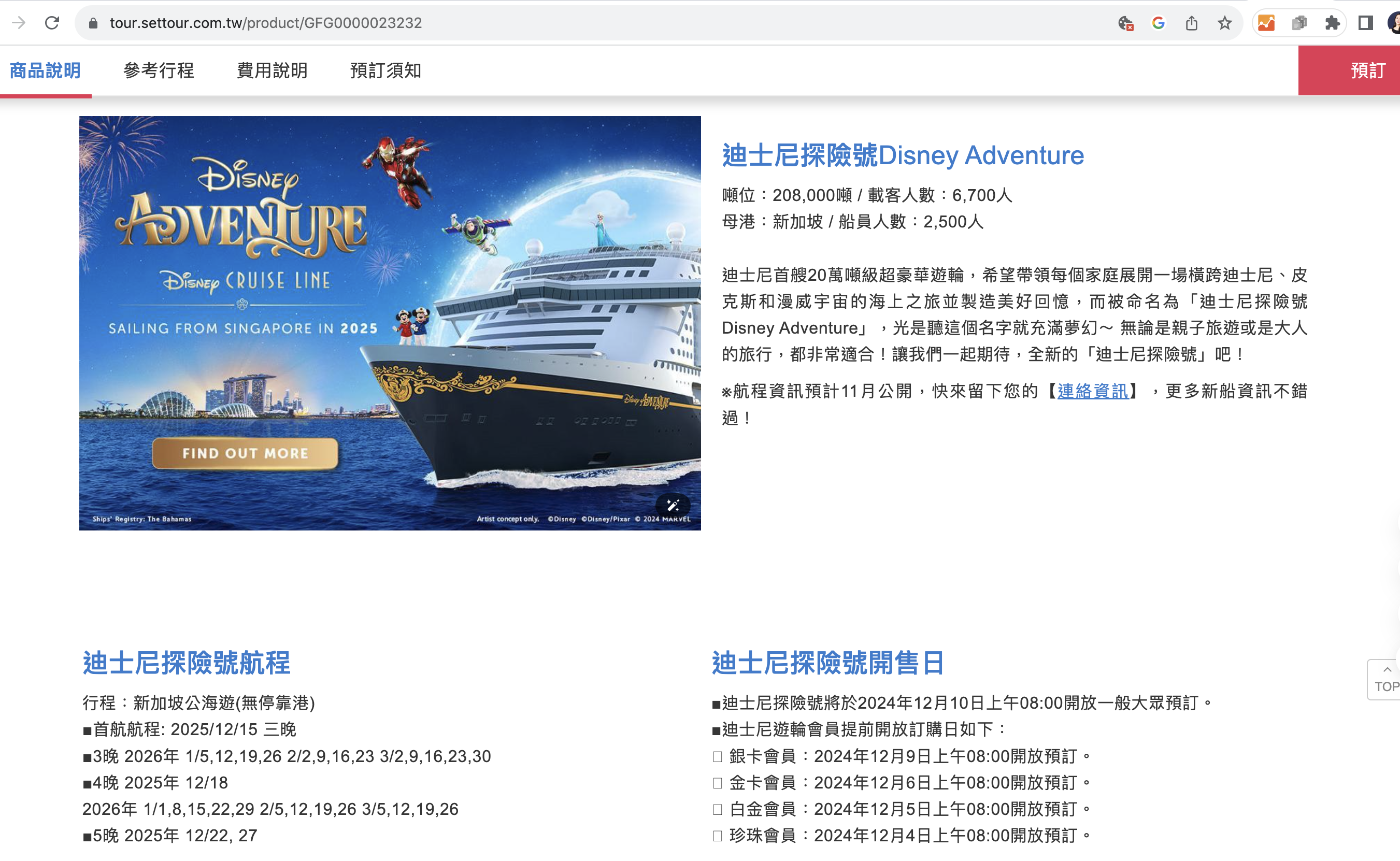 迪士尼郵輪探險號(Disney Adventure)為亞洲首艘迪士尼郵輪,以新加坡為主要出發港,航程多為3-4晚,2026年價格依房型、日期與平台浮動,內艙房最低約NT$15,600-44,000/人起(約USD$479起),陽台房約NT$15,400-35,600/人起,總預算含機票、小費與住宿,2人親子約NT$7-20萬起。