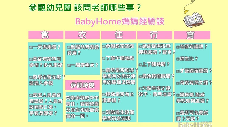 - 建議先父母參觀,再帶寶寶:先自行評估環境後,再帶小朋友確認是否適合,避免父母主觀判斷忽略孩子喜好。