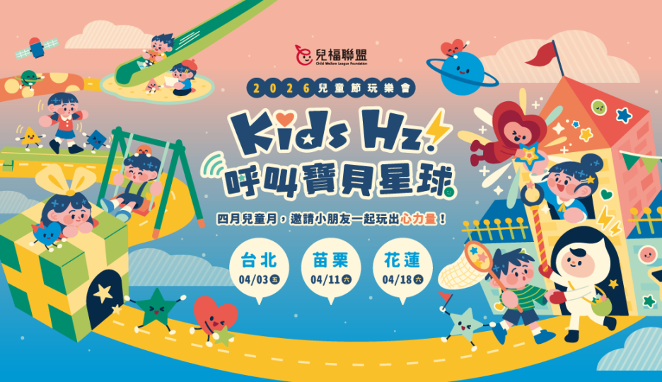 Kids Hz!呼叫寶貝星球|2026 兒童節玩樂會 是兒福聯盟主辦的全台兒童節系列活動,針對18歲以下兒童提供闖關集章、舞台表演、有獎徵答及親子遊戲,集滿印章可兌換限量禮物。