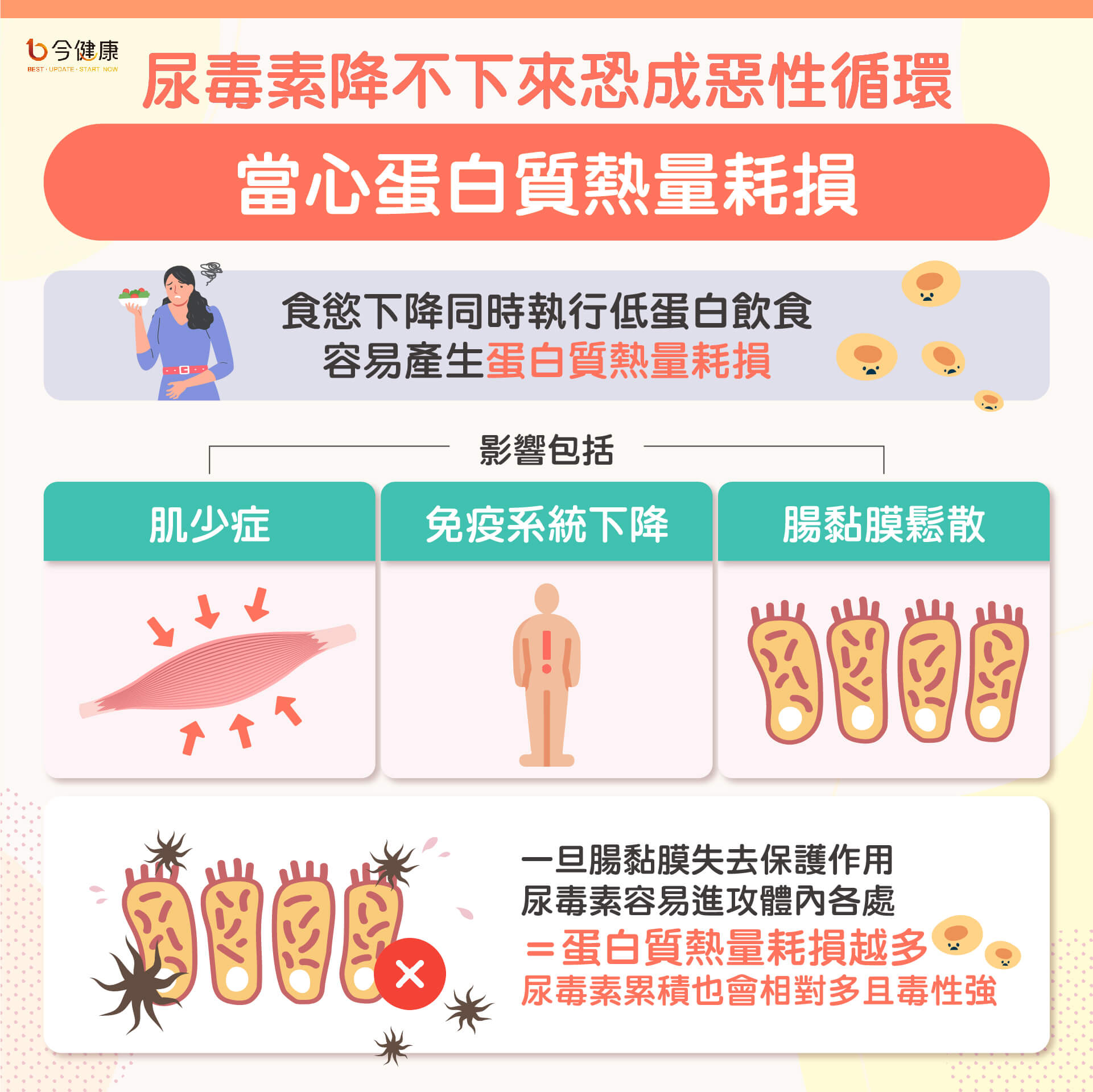 - 尿毒症患者更嚴格控制蛋白質及電解質,避免過勞及感冒。