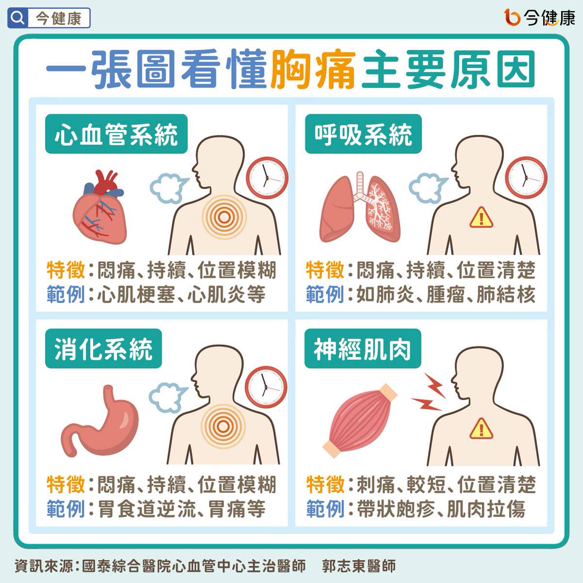 - 肌肉骨骼系統問題:最常見胸痛來源,包括胸肋關節痛、肋軟骨炎、肌肉拉傷或外傷史,特徵為局部壓痛,深呼吸或運動加劇,常無系統性症狀。