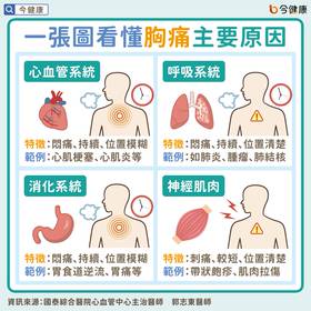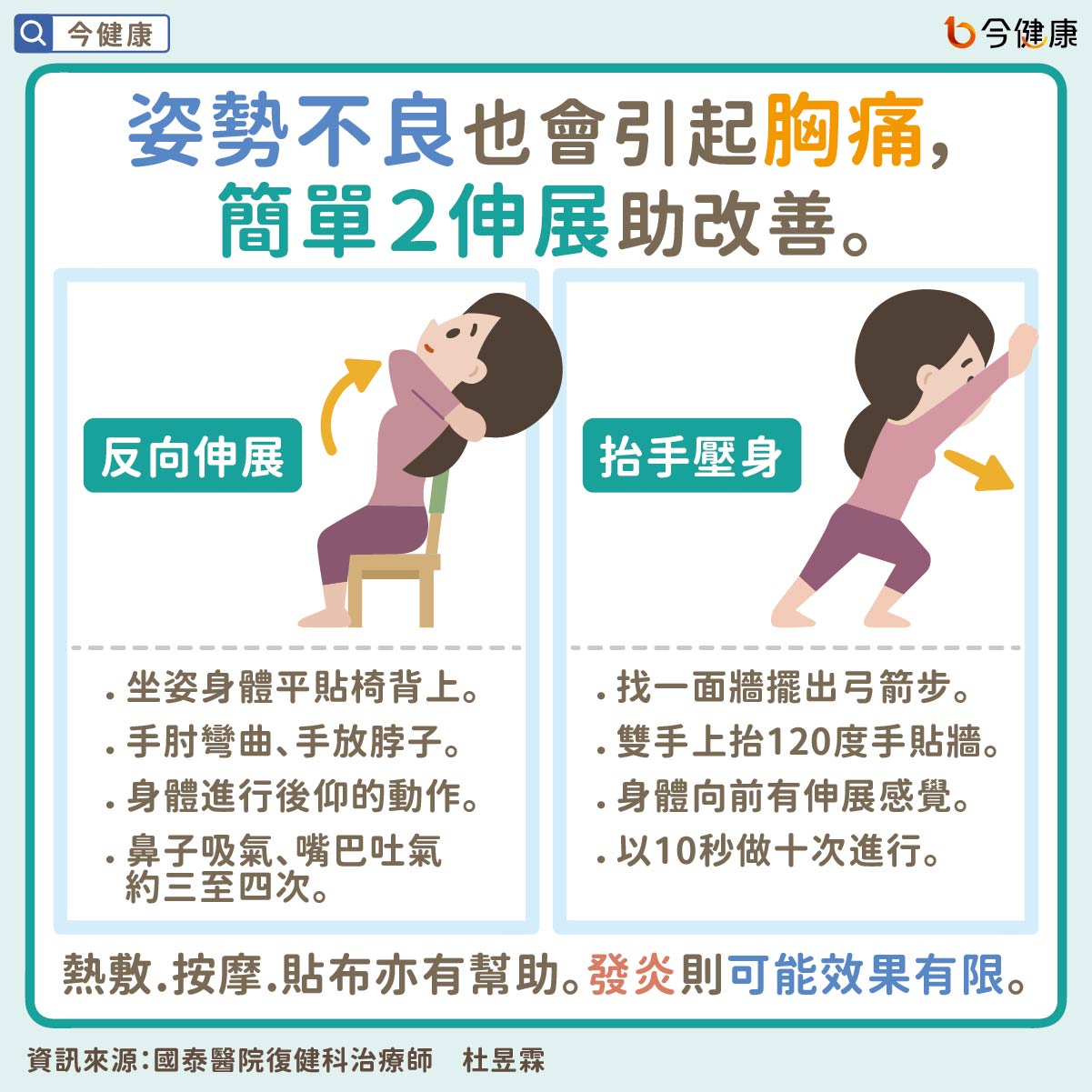 症狀特徵:肌肉受傷發炎屬於較淺層的痛,有明顯壓痛點,且在改變姿勢時會更疼痛。若胸痛在姿勢不良且改變姿勢的情況下發生,並在伸展身體、更換姿勢幾分鐘後逐漸緩解,就很有可能是姿勢不良所引起。