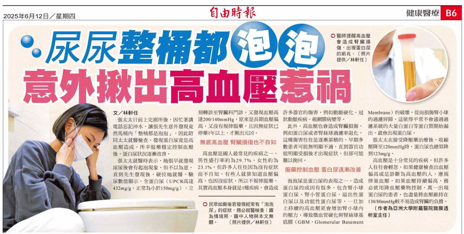 高血壓 泡泡尿伴隨高血壓時,需要特別注意腎臟病變的可能性。