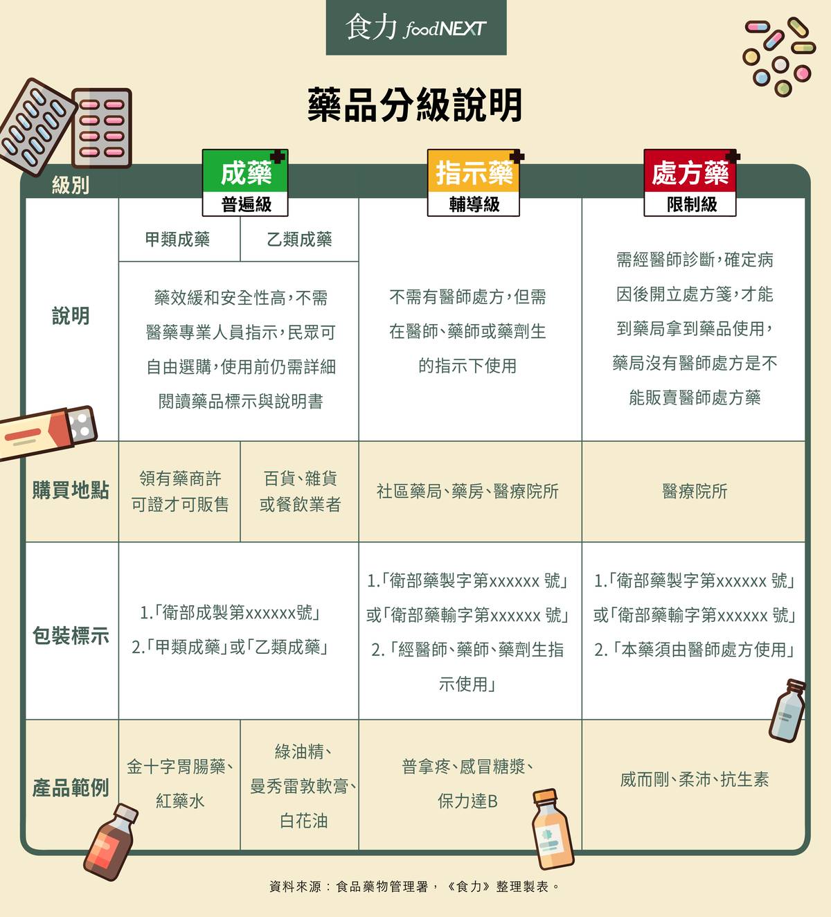 - 線上查詢:透過食藥署網站的「西藥、醫療器材及化粧品許可證查詢系統」,輸入藥品名稱即可查詢其分類(成藥、指示藥或處方藥)。也可查看藥品外盒或說明書(仿單)標示。