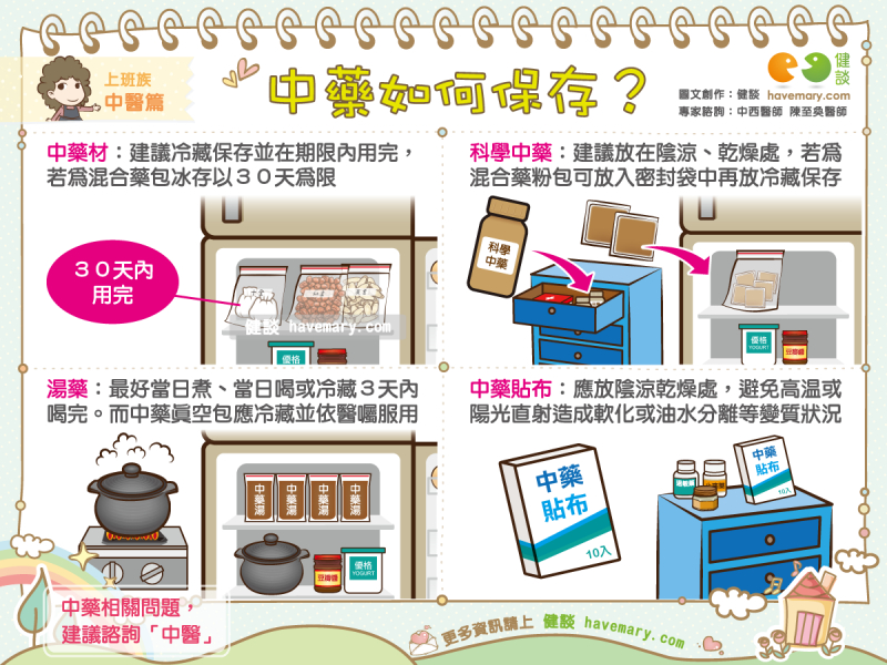 - 藥粉(包括磨粉藥品與中藥粉):易受潮變質,建議僅於醫師開立天數內服用,未吃完直接丟棄。 中藥粉若僅結塊但無變質(顏色、味道改變、斑點或無法攪散),可繼續使用;存放時用雙層夾鏈袋密封,避免頻繁開合或冰箱取出後未即食。