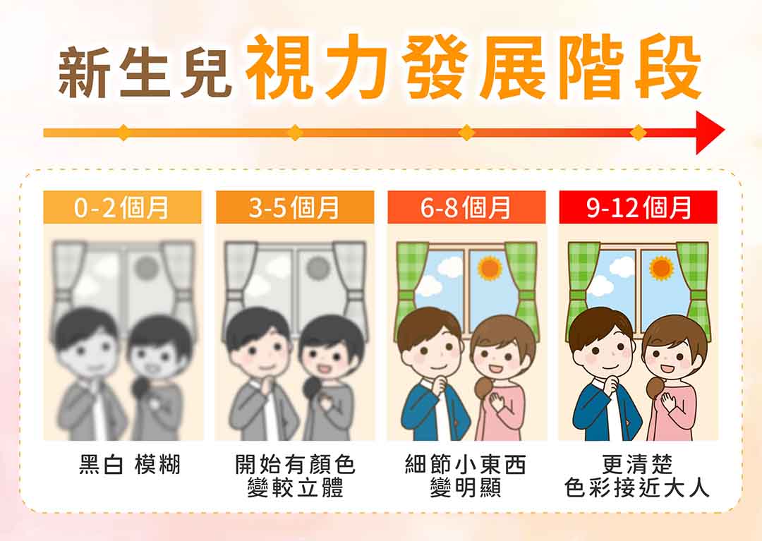 - 0-6個月:提供黑白/高對比刺激、自然光線,避免過暗。