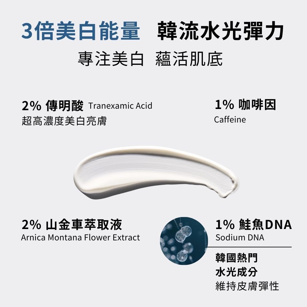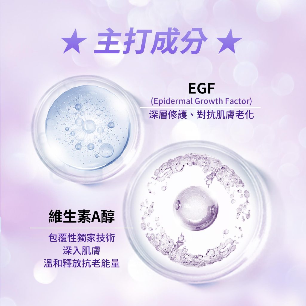 - EGF生長因子:改善眼周細紋,適合熟齡肌,提供緊緻修護。