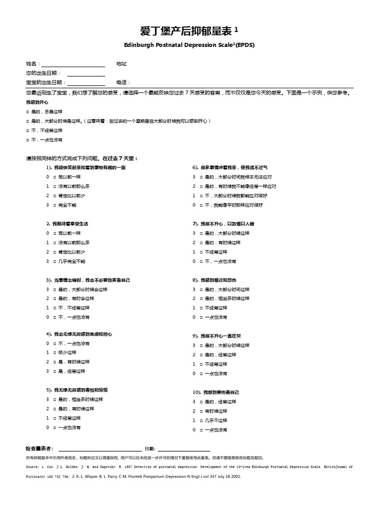 愛丁堡產後憂鬱量表(EPDS) 是全球廣泛使用的10題篩檢工具,用於評估孕期24-26週後或產後婦女的憂鬱風險,評估過去7天(而非僅今天)的感受,每題得分0-3分,總分最高30分。
