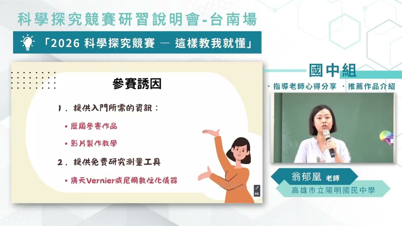 - 作品繳交:自2026年3月1日起,至截止日前完成上傳文字與影片作品,強調科學探究過程(質疑、假設、數據分析、驗證等)。