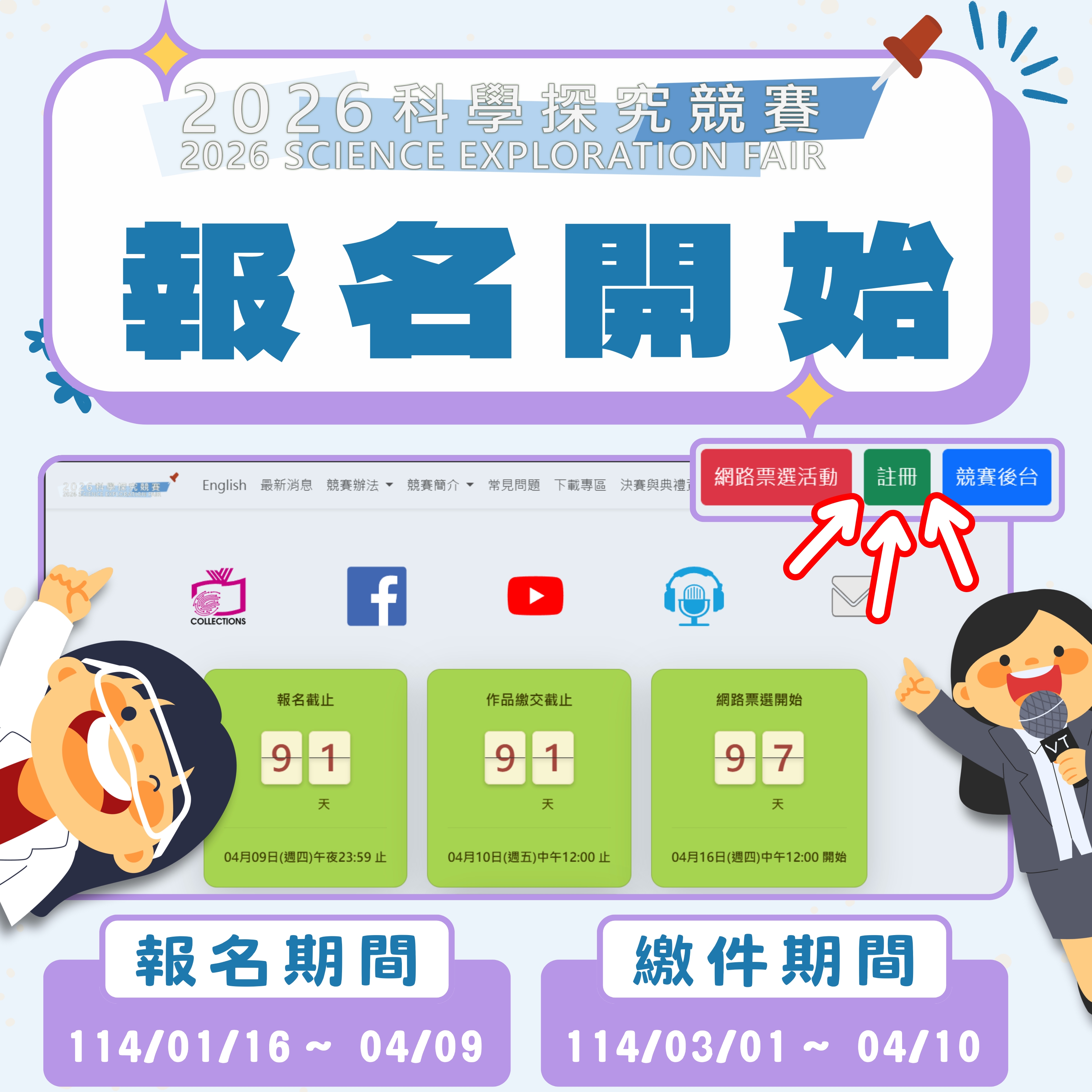- 線上報名:自2026年1月16日(週五)午夜00:00起,至4月9日止,透過官方網站 https://sciexplore2026.colife.org.tw 報名。