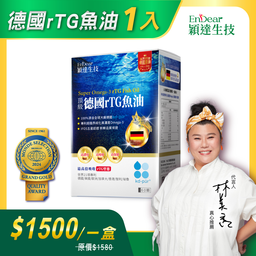 - rTG型態(再酯化三酸甘油酯):吸收率最高倍,無腥味且好吸收,每日2顆即可補足Omega-3所需量。