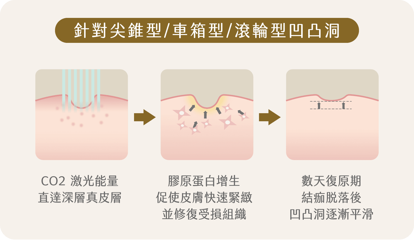 雷射(如皮秒雷射、梭時雷射)透過光熱效應由表皮向真皮傳遞能量,精準加熱刺激膠原蛋白再生,常與微針搭配用於嚴重凹痘疤。