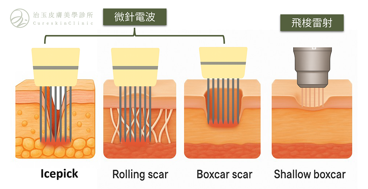 微針電波則結合微針與射頻能量,直接將熱能傳至真皮層,調節皮脂腺並刺激膠原再生,恢復期約7天。