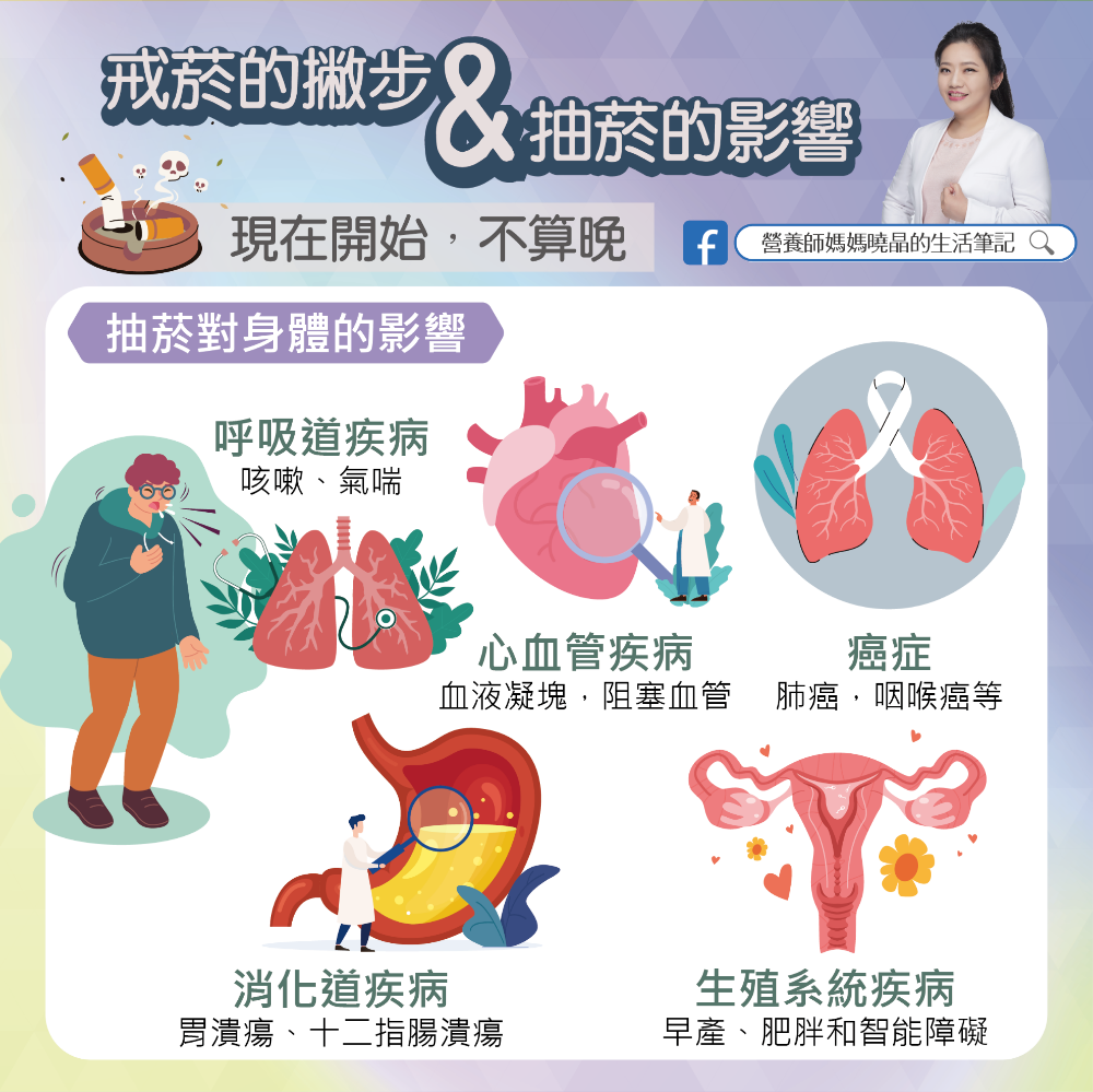 - 其他危害:提高肺阻塞風險6.3倍、癌症(如胃癌、肺癌)、心血管疾病發生率;戒菸超過20年,內臟脂肪才與非吸菸者無異。