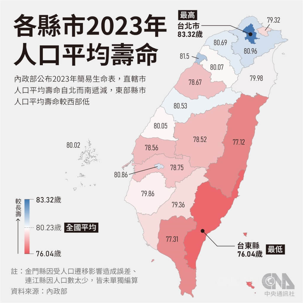 台北市平均壽命最高(83.40歲),台東縣最低(75.97歲),差距達7.43歲,主要受醫療資源及交通便利性影響。