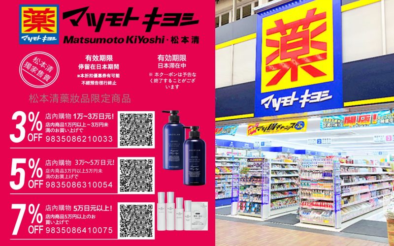 日本藥妝店(如松本清、SUNDRUG、大國藥妝)與便利商店(如7-11)常提供遊客專屬優惠券,結帳時出示手機畫面或列印券加護照,即可享免稅10% + 額外3-10%折扣,滿額門檻多為未稅1萬日圓起。