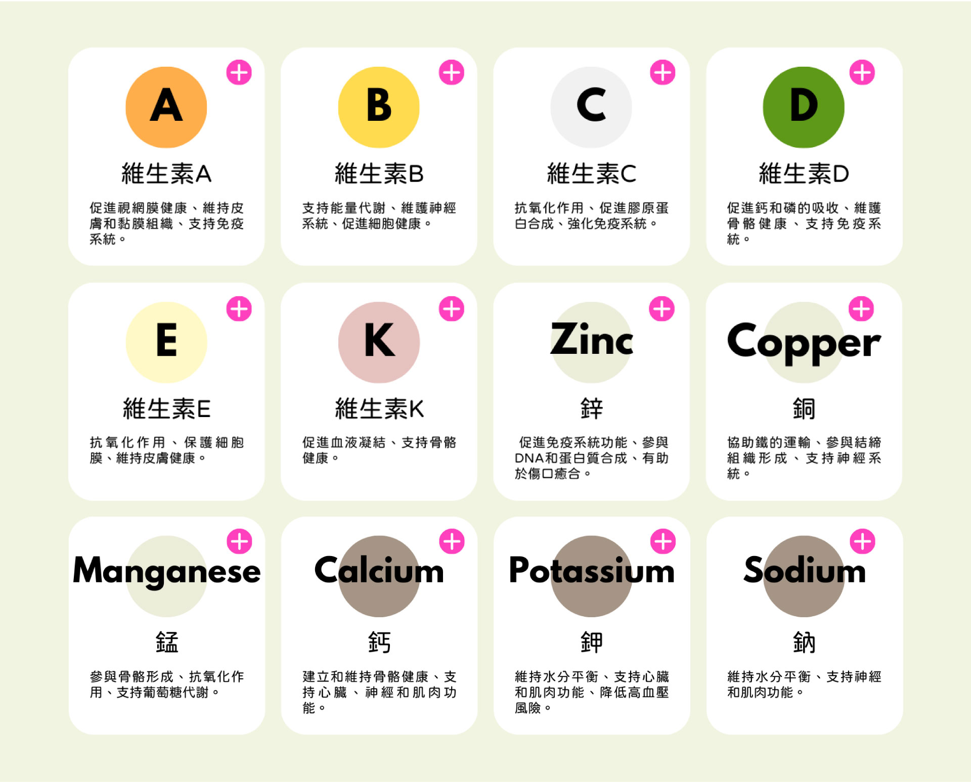 | 礦物質(如鎂、鈣、鐵、鋅) | 肌肉/神經功能、血液凝固、紅血球形成、傷口癒合、新陳代謝。 |