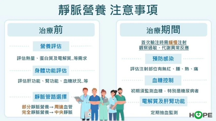 - 施打方式:需由營養師評估、藥師調劑,通常經中央靜脈導管滴注16-24小時,長期使用可能有血栓、感染、高血糖、低血糖、電解質異常等併發症。
