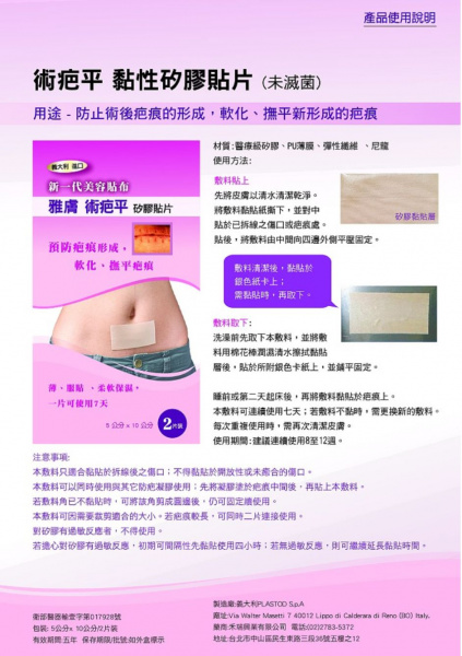 - 貼法:清潔皮膚、修剪毛髮,貼片大小超過疤痕範圍。初期夜間使用,避免活動影響;適應後全天貼敷。美容膠帶可先用2-4週減張力,後轉矽膠貼片。