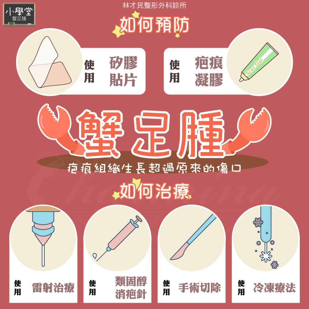 蟹足腫(keloid)治療常見方法包括類固醇注射、手術合併放射線、冷凍治療及其他藥物注射,各有特定副作用與注意事項。
