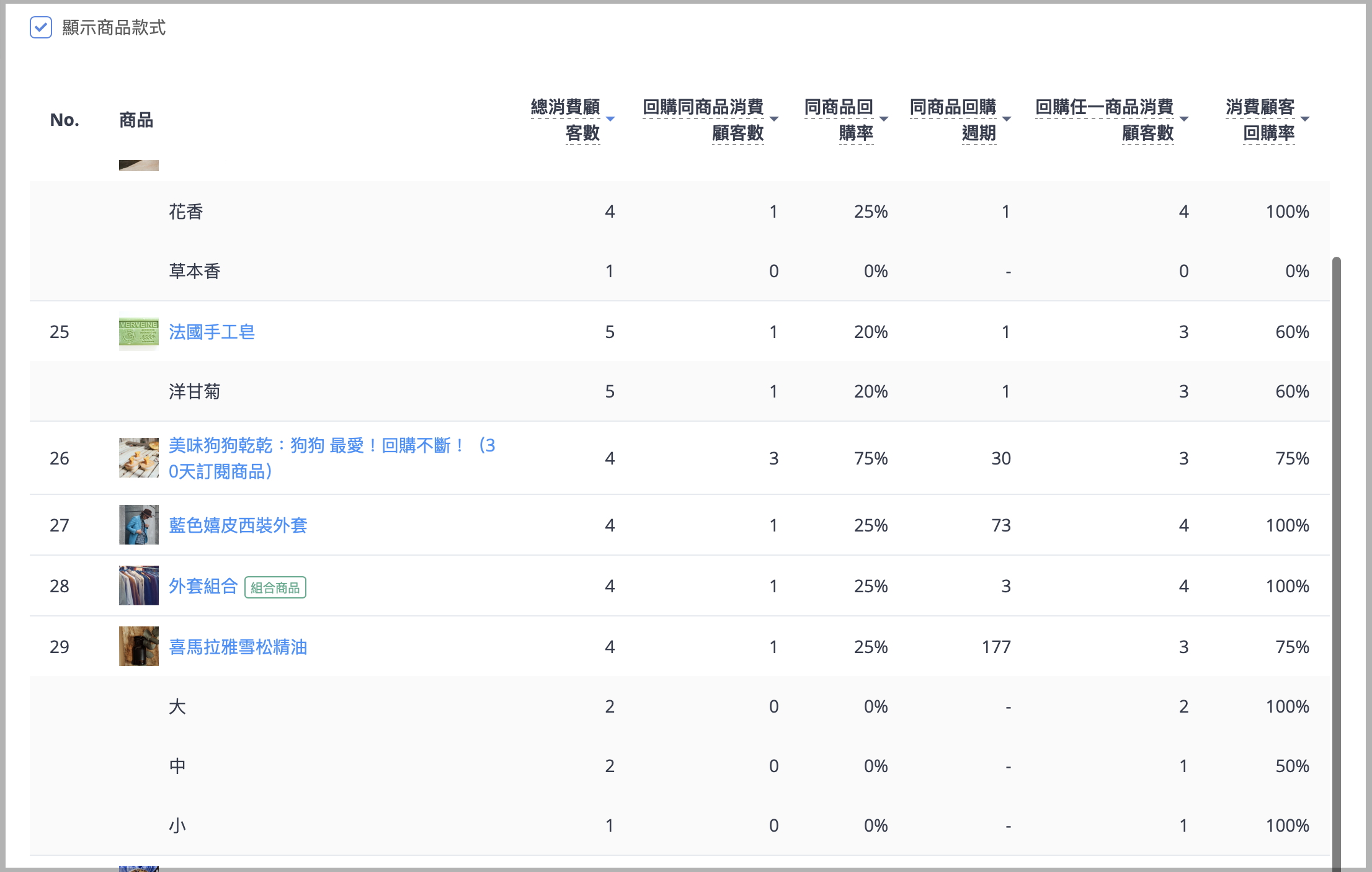 | 同商品回購率 | 100位中15位回購相同商品(15%),平均58天 | 反映特定商品滿意度高,適合調整庫存策略。 |