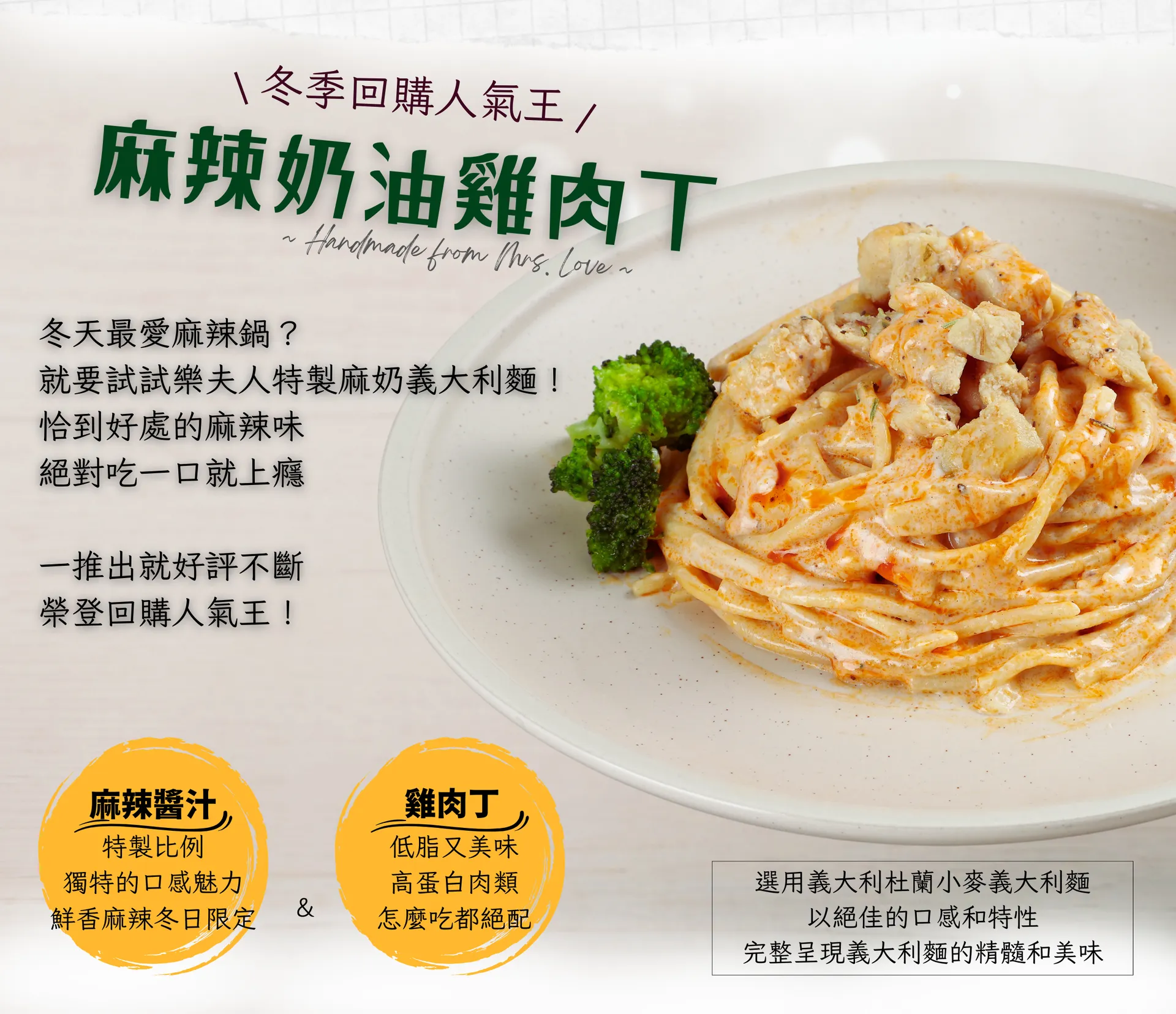 樂夫人採用醬麵分開的設計,避免麵體吸附湯汁後加熱容易過軟爛的問題。麵體現做可冷凍保存三個月,提供加大份量(200g)和一般份量(150g)選擇。