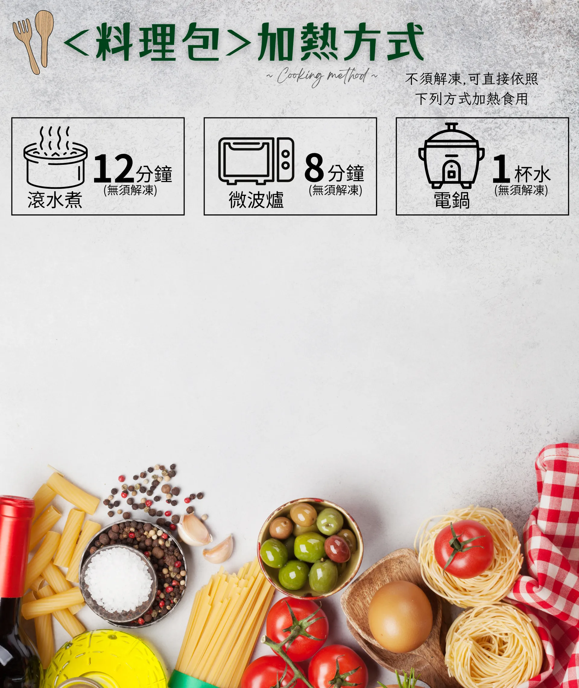 - 隔水加熱(最推薦):不拆封,直接放入沸水中,水位蓋過包裝,加熱至沸騰後即可食用,無需解凍。