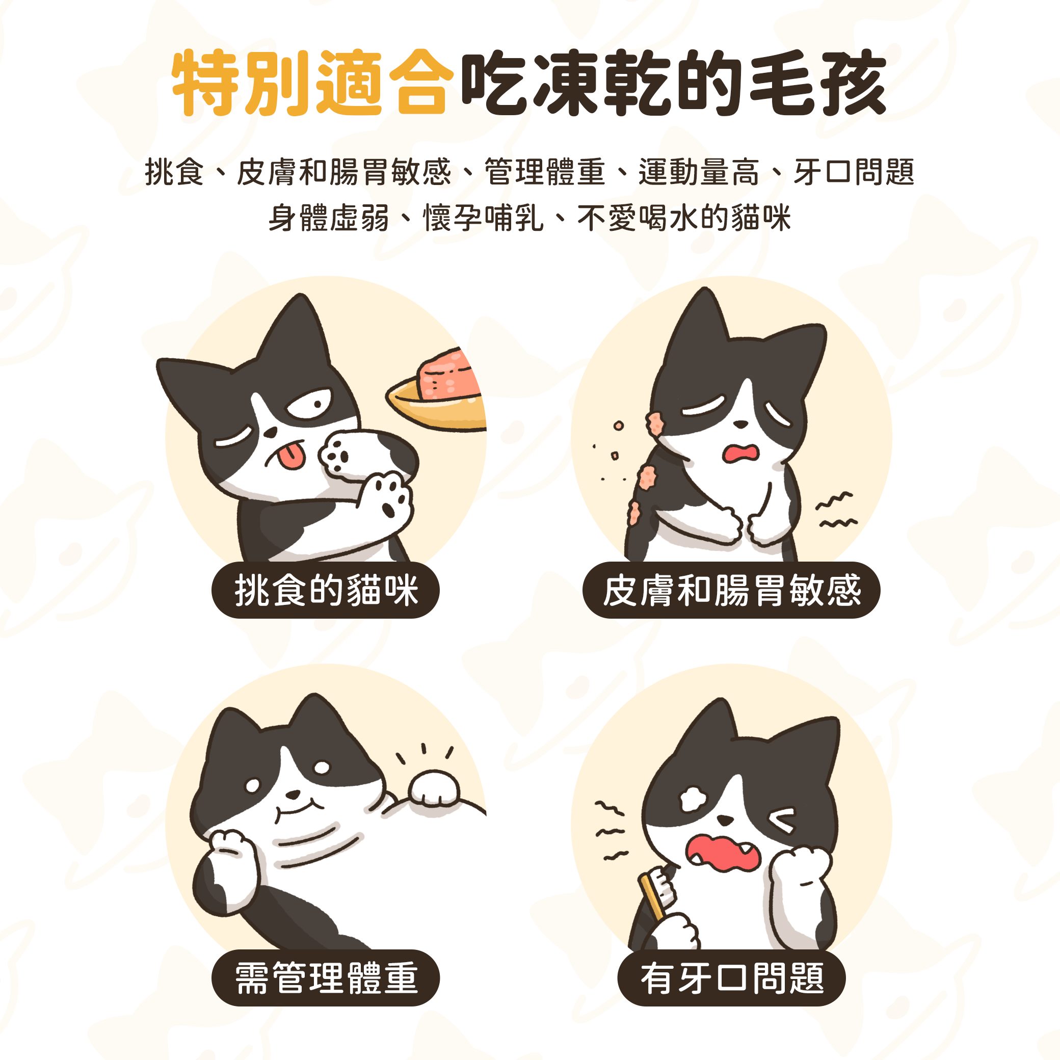 凍乾本身低碳水化合物的特性對貓咪腸胃較為友善。對於敏感腸胃、挑嘴或需高水分的貓,凍乾可作為健康補充。然而,若要用凍乾作為主食,應漸進式轉換以避免消化不適。