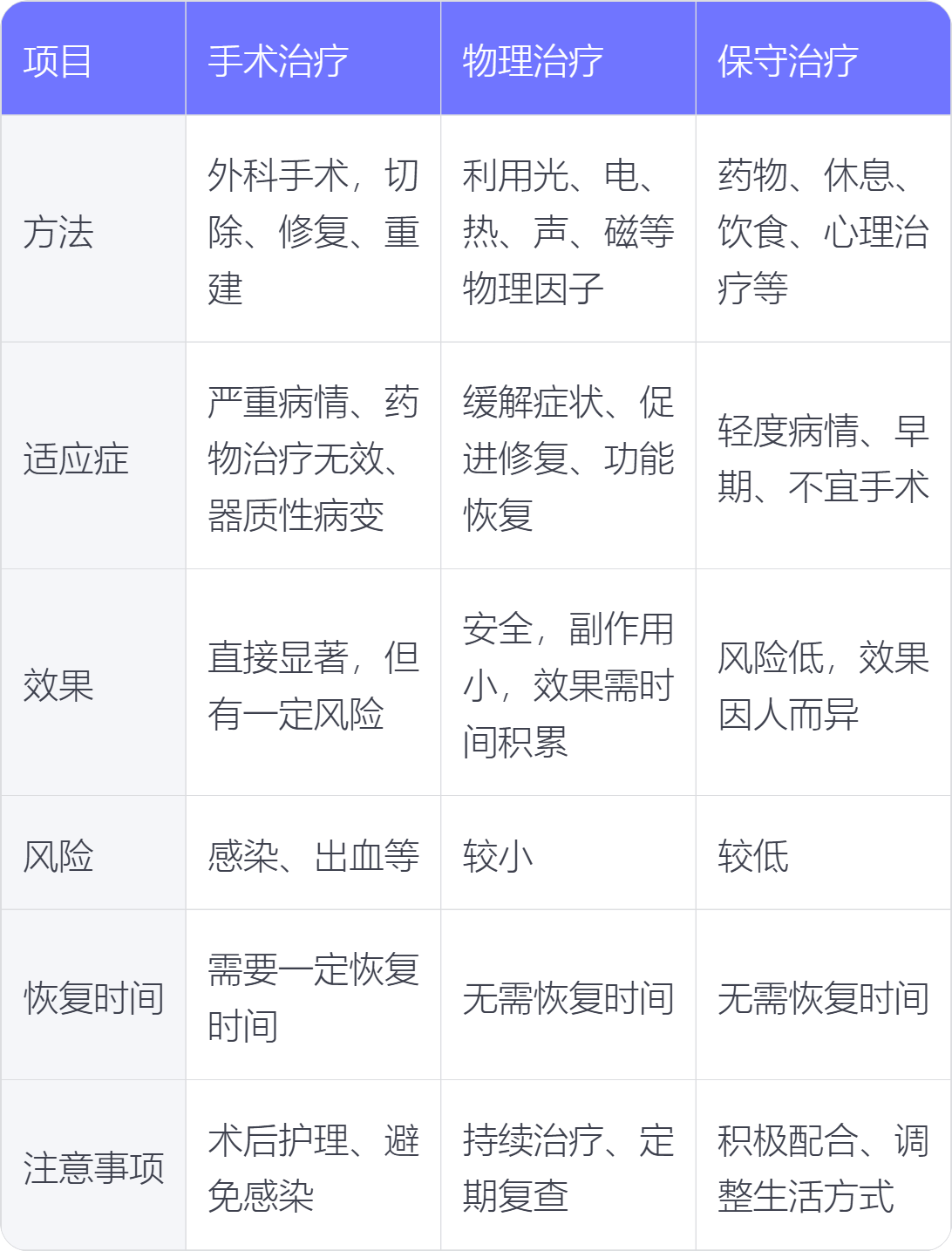 以下表格彙整主要疾病的保守療法與手術治療差異,基於療效、適用對象及風險: