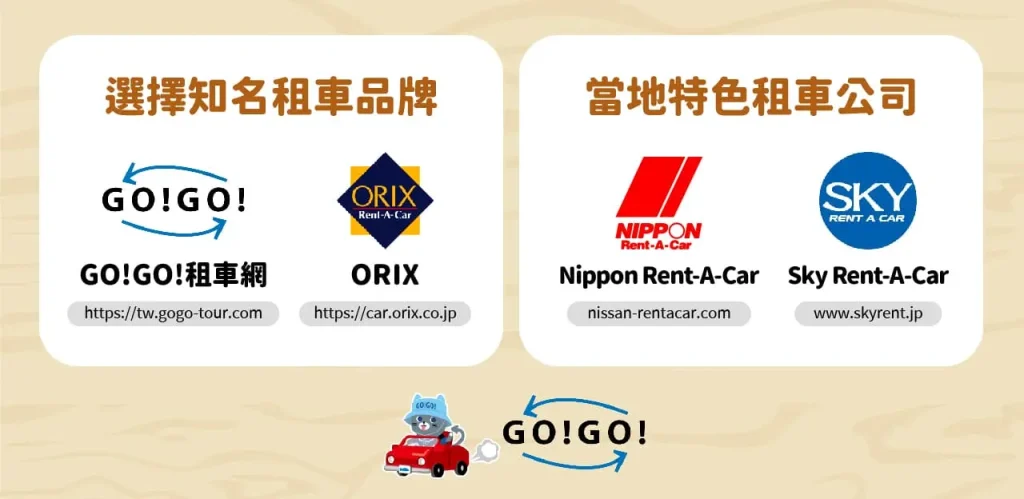 - ORIX Rent A Car:車況穩定,部分站點夜間取車,Klook優惠NT$1,436起/天。