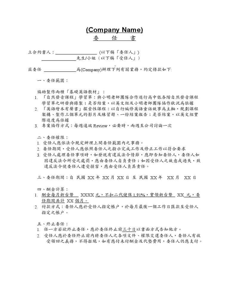 - 委任契約書範本:可參考公會版,包含甲乙雙方條款,簽訂時乙方須口述內容確認。