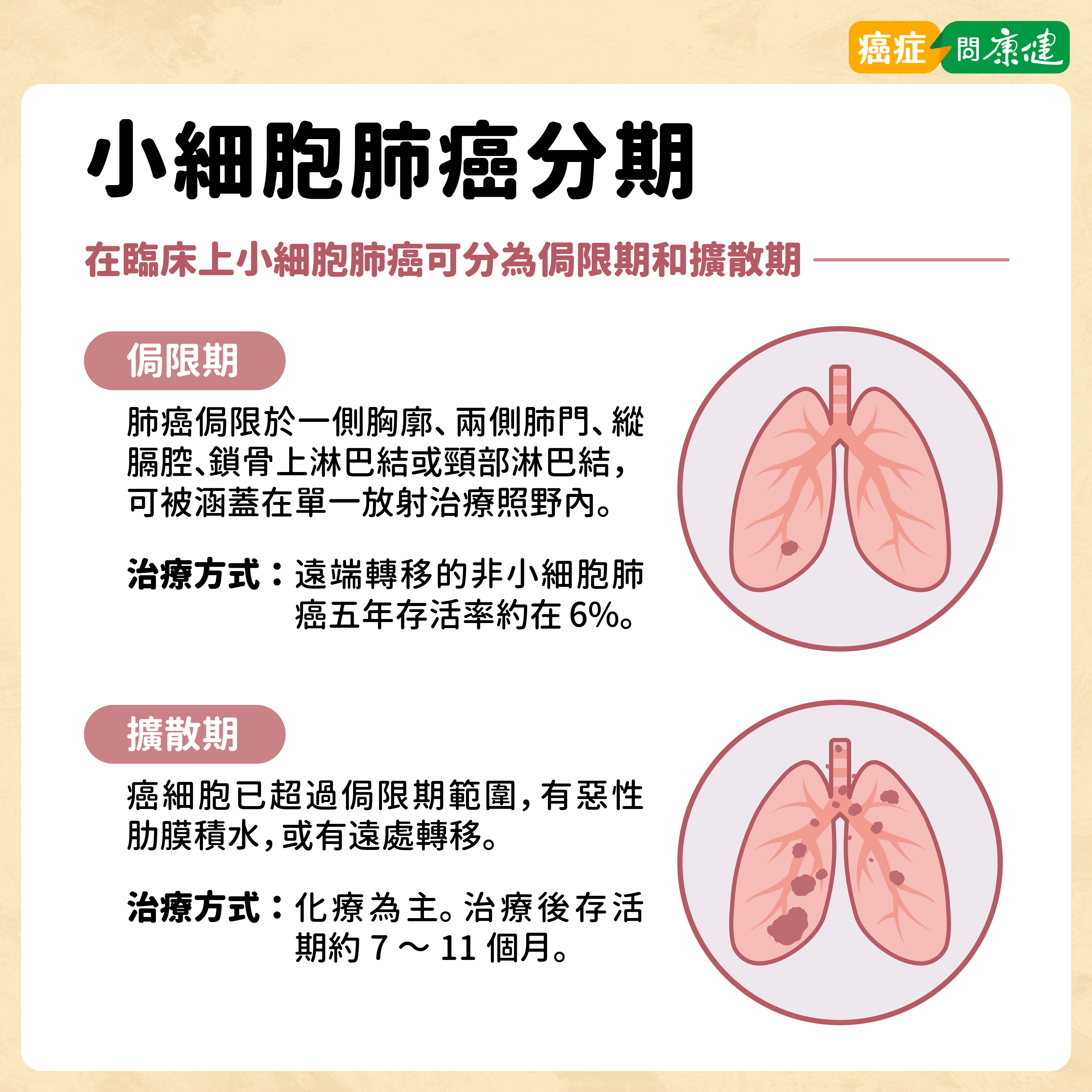 - 比例與生長速度:佔肺癌85-93%,生長及轉移速度較慢,適合手術治療,但僅少數患者診斷時可手術。